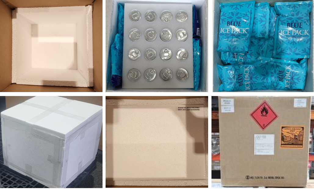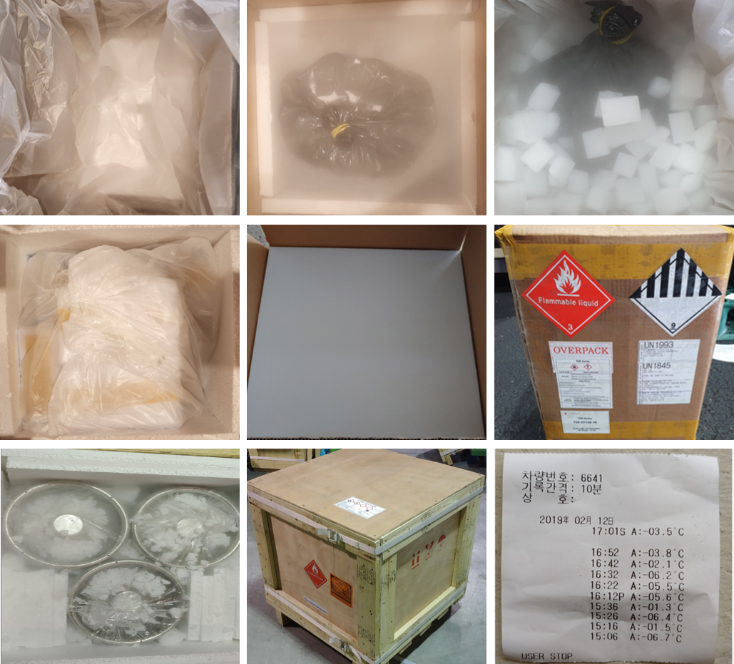 - 안전 규정 준수 : 스티로폼 박스로 1차 밀봉 후, UN규격 포장 및 위험물 라벨링 마감